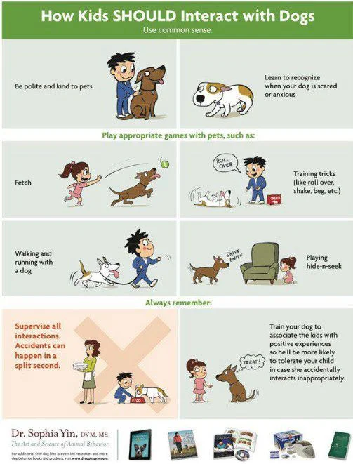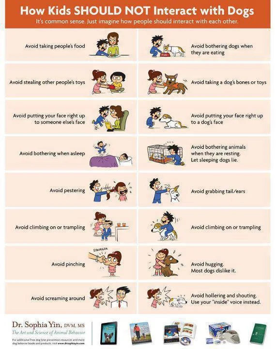 These charts by Dr. Sophia Yin are great teaching tools to sit and have a conversation with your child, children who will be visiting, and maybe even some adults. Take the time to have a teaching moment.