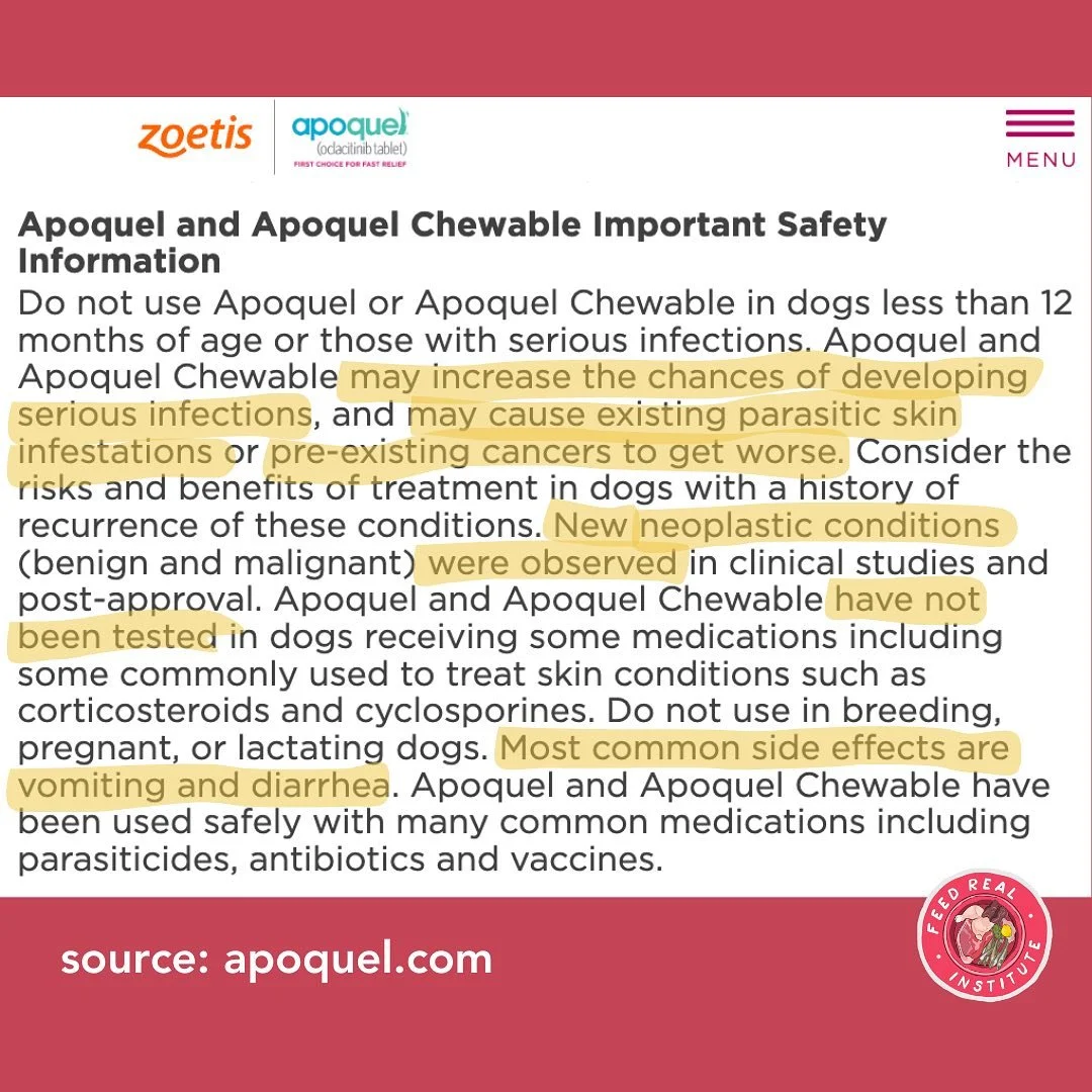 “Apoquel affects kinases (essential signaling compounds that the body’s cells use to communicate with each other) which can cause intolerable low white and low red cell count, stunted growth and can increase the dog’s risk of cancer. Don’t take our word for it... it’s listed on Apoquel’s website.